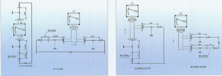 流量計(jì)應(yīng)垂直安裝,流量計(jì)中心線與鉛垂線的夾角不超過5°。在累計(jì)的上游須保證五倍公稱通徑的入口直管段,下游保證250mm出口直管段。如果介質(zhì)中含有固定雜質(zhì),應(yīng)在流量計(jì)上游加裝過濾器,如果介質(zhì)中含有鐵磁性物質(zhì),應(yīng)在流量計(jì)的上游安裝磁過濾器。為了便于維護(hù)和清洗且不影響,建議安裝旁通管路。